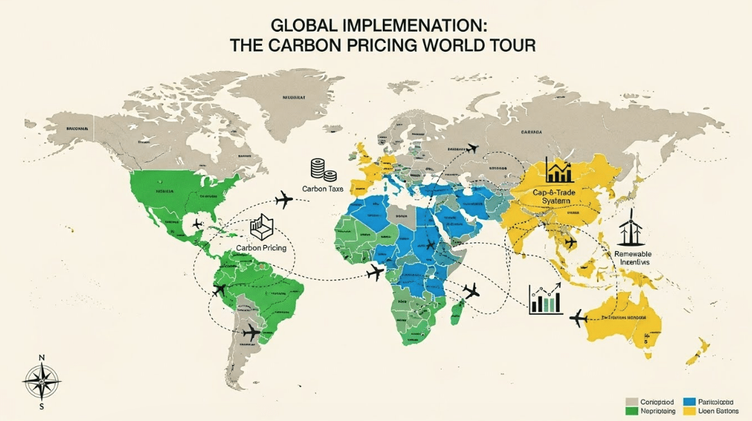 The grand tour reveals something unexpected: Carbon pricing isn’t one thing. It’s a Nordic carbon tax. It’s a Chinese intensity-based ETS. It’s a Brazilian cap-and-trade system still being designed. It’s American state initiatives. It’s a Saudi voluntary market. It’s an Egyptian response to European trade policy.